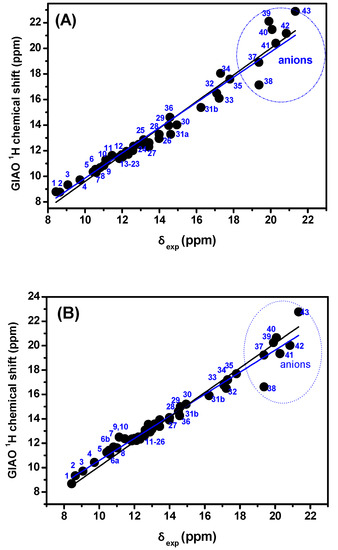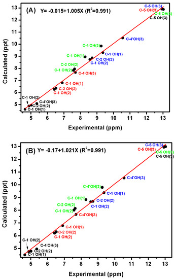 Calculated (at the GIAO/B3LYP/6-311G+(2d,p) level of theory with CPCM in CHCl3) vs. experimental chemical shifts of the OH protons of the compounds 1–43 of Figure 9 with minimization of the structures at the M06-2X/6-31+G(d) (A) and B3LYP/6-31+G(d) (B) level of theory, respectively. The blue line corresponds to the linear fit and the black line to the linear fit through the zero. Reprinted, with permission, from [47]. Copyright 2015, The Royal Society of Chemistry.
