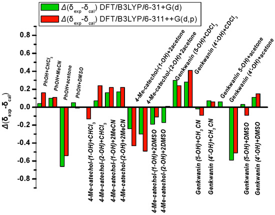 Siskos et al. [46] reported that accurate solvent dependent 1H-NMR chemical shifts of the –OH groups of phenol (1), 4-methylcatechol (2) and genkwanin (3) (Figure 5) can be obtained, compared to the experimental values, using a combination of DFT, conductor-like polarizable continuum model (CPCM) and discrete solute-solvent hydrogen bond interactions involving a single solvent molecule. In contrast, the calculated 1H chemical shifts of phenolic OH groups with the CPCM model, without incorporation of a single solvent molecule, were found to deviate significantly from the experimental value especially in the case of hydrogen bonding solvents. Thus, in DMSO-d6 the experimental value of the OH group of phenol (1) was found to be 9.36 ppm, while the computed value at 4.27 ppm [46]. Figure 6 illustrates excellent correlation between experimental and calculated (with the GIAO method at the B3LYP/6-311++G(2d,p) level of theory) 1H-NMR chemical shifts of the compounds of Figure 5 with minimization of the complexes, with a single solvent molecule, at the B3LYP/6-31+G(d) and B3LYP/6-311++G(d,p) level of theory. The R2 values of 0.991 in both cases demonstrate excellent correlation between solvent dependent experimental and calculated 1H chemical shifts of phenol OH groups. Furthermore, it was concluded that very large basis sets are not necessary for energy optimization in order to reproduce accurately experimental 1H chemical shifts. The histogram of Figure 7 shows that the calculated 1H chemical shifts in acetone had the larger error (≥0.3 ppm) with the exception of the C–5 OH of genkwanin. This was attributed to the fact that the plane of the acetone molecule, contrary to the case of DMSO and acetonitrile, deviates from the aromatic plane. The dihedral angle between the planes of the two molecules was found to be strongly dependent on the basis set used [46].