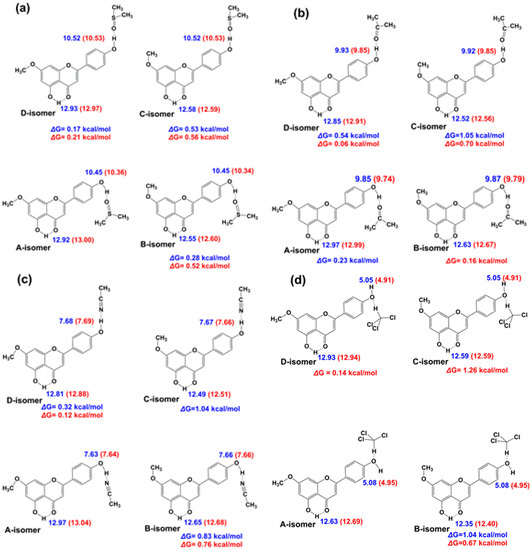 The effect of conformation of the C-7 OCH3 and C-4′ OH groups on the chemical shifts of the C-4′ OH and C-5 OH protons for the 1:1 complexes of (a) genkwanin + DMSO; (b) genkwanin + Me2CO; (c) genkwanin + MeCN, and (d) genkwanin + CHCl3, with the use of DFT/B3LYP/6-31+G(d) (data in blue) and DFT/B3LYP/6-311++G(d,p) (data in red), level of theory. Adopted, with permission, from [46]. Copyright 2013, The Royal Society of Chemistry.