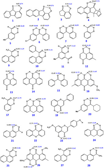 Siskos et al. [47] reported an approach for predicting hydrogen bond distances beyond the limits of X-ray diffraction methods, based on quantum chemical calculations of O–H···O 1H chemical shifts using a combination of DFT and conductor-like polarizable continuum model (CPCM) in CHCl3 without incorporating discrete solvent molecules. For a large set of 35 compounds (Figure 9), exhibiting intramolecular O–H···O hydrogen bonds, very good linear correlations between experimental and computed (at the GIAO B3LYP/6-311++G(2d,p) level of theory) 1H chemical shifts were observed with minimization of the structures at the B3LYP/6-31+G(d) and M06-2X/6-31+G(d) level of theory, with coefficients of linear regression R2 of 0.977 and 0.965, respectively (Table 1, Figure 10). Further geometry optimizations were performed for selected molecules of Figure 9 with the computationally more demanding MP2/6-31+G(d) level of theory which includes electron correlation effects. The structural characteristics and computed 1H chemical shifts were in close agreement with those obtained at the B3LYP/6-31+G(d) and M06-2X/6-31+G(d) level of theory.