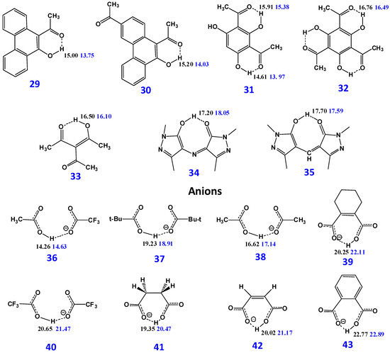Chemical formulas of phenol compounds exhibiting intramolecular O–H···O hydrogen bonds and ionic complexes with intramolecular and intermolecular O–H···−O hydrogen bonds. The data in black and blue are the computed 1H chemical shifts, ppm, with minimization of the structures at the B3LYP/6-31+G(d) and M06-2X/6-31+G(d) level of theory, respectively (see Table 1). Reprinted, with permission, from [47]. Copyright 2015, The Royal Society of Chemistry.