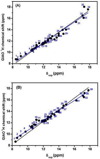 Calculated (at the GIAO/B3LYP/6-311G+(2d,p) level of theory with CPCM in CHCl3) vs. experimental chemical shifts of the OH protons of the compounds 1–35 of Figure 9 with minimization of the structures at the M06-2X/6-31+G(d) (A) and B3LYP/6-31+G(d) (B) level of theory, respectively. The blue line corresponds to the linear fit and the black line to the linear fit through the zero. Reprinted, with permission, from [47]. Copyright 2015, The Royal Society of Chemistry.