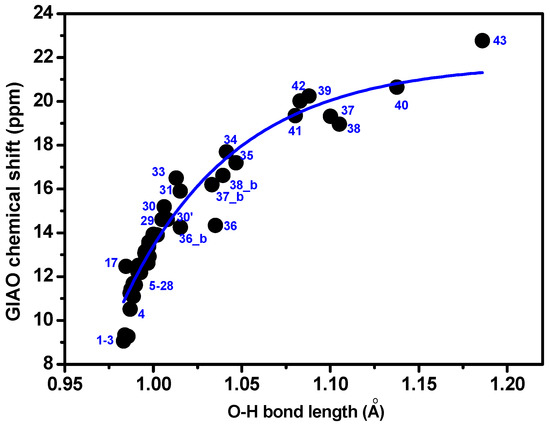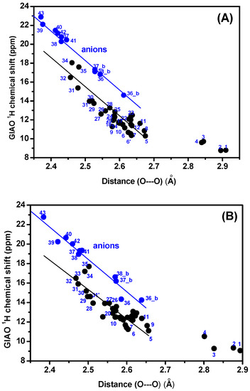 for minimization of the structures at the M06-2X/6-31+G(d) and B3LYP/6-31+G(d) level of theory, respectively (Figure 13). The resulting slope of −19.83 Å−1 and −20.49 Å−1 clearly demonstrate the great sensitivity of δ(OH) upon the (O)H)···O hydrogen bond length. Taking into consideration the statistics of Equations (1) and (2), it was concluded that hydrogen bond distances with an accuracy of ±0.02 Å to ±0.03 Å can be estimated for (O)H)···O and (O)H)···−O hydrogen bonds in the range of 1.24 Å to 1.85 Å. Furthermore, it was claimed that quantum chemical calculations of 1H chemical shifts can provide hydrogen bond distances of labile hydrogens beyond the limits of X-ray crystallography [47]. Compounds 1–4 were not included in the linear regression analysis since they exhibit relatively weak hydrogen bond with > 1.9 Å. Similarly, non-linear behavior has been observed in quantum chemical calculations of acetone-phenol (1:1) complexes at > 2.1 Å [80].