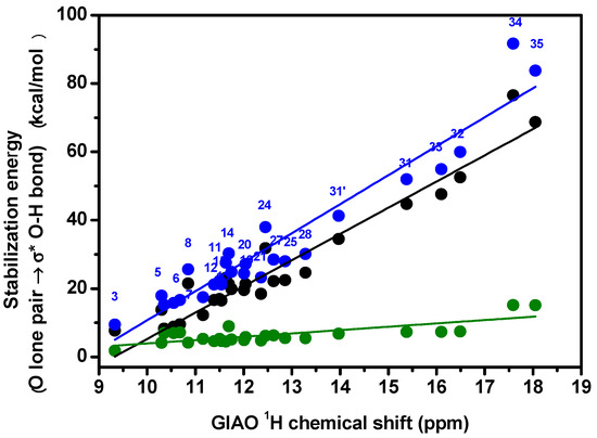 Calculated, at the GIAO DFT/B3LYP/6-311+G(2d,p) level of theory with CPCM in CHCl3, chemical shifts of the compounds of Figure 9 with minimization of structures at the M06-2X/6-31+G(d) level of theory) vs. stabilization energy (Second Order Perturbation Theory Analysis) between the lone pairs of the oxygen of the carbonyl group with the σ* antibonding orbital of the H-O bond) (lone pair 1 in black, R2 = 0.946, lone pair 2 in green, R2 = 0.575, and the sum in blue, R2 = 0.921). Reprinted, with permission, from [47]. Copyright 2015, The Royal Society of Chemistry.
