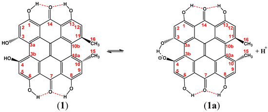 Recently, Siskos et al. [50] investigated the position of labile hydrogen involved in O–H···O intramolecular hydrogen bond in hypericinate (Figure 17). Table 3 illustrates a comparison of intramolecular hydrogen bond distances and dihedral angles of the calculated structures, at the B3LYP/6-31+G(d) (IEF-PCM in DMSO) and at the TPSS/TZVP (IEF-PCM in DMSO) level of theory, of the hypericine ion (1a) with those of the X-ray structure. The calculated intramolecular distances of the heavy atoms, such as the O(1)···O(14), O(6)···O(7), O(3)···O(4), O(13)···O(14) and O(8)···O(7) distances, were found to be in excellent agreement with those of the X-ray structure [97]. Similarly, the dihedral angles C(3)–C(3a)–C(3b)–C(4) and C(10)–C(10a)–C(10b)–C(11) were shown to indicate minor differences. On the contrary, significant differences have been observed in the location of all hydrogen atoms involved in intramolecular hydrogen bonds between the calculated and the X-ray structure, most notably in the O(1)–H(1) and O(13)–H(13) bond distances which deviate by 0.11 Å.