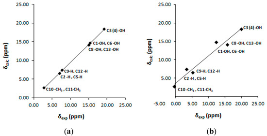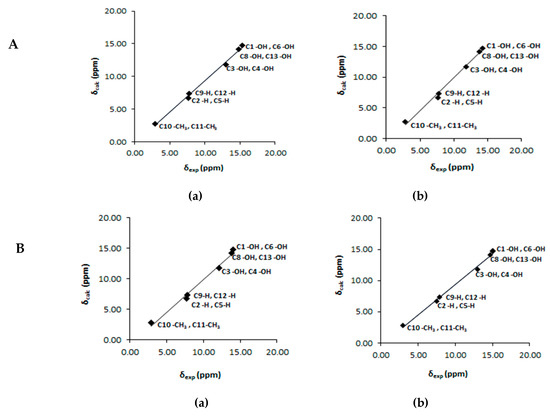 Computational modeling of 1H and 13C chemical shifts has been widely used to assist in the assignment or reassignment of experimental spectra and in the elucidation of chemical structures [45]. Chemical shifts of hydroxyl groups, however, have rarely been investigated at the quantum chemical level. This may be attributed to the fact that –OH groups displayed broad signals and variable chemical shifts at room temperature due to intermolecular exchange of the –OH protons with protons of the protic solvents or with protons of the residual H2O in aprotic solvents. However, optimization of experimental conditions, such as pH, temperature and NMR solvent may result in obtaining extremely sharp peaks (Δν1/2 ≤ 2 Hz) which can lead to unequivocal assignment of the OH signals [64,65,66,67,92,93,94].