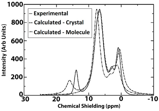 The application of quantum chemical methods or solid materials was greatly improved with the development of the gauge including projector augmented wave (GIPAW) approach, which enabled the calculation of magnetic shielding of an inherently periodic solid using a plane wave basis set [103,104]. Thus, accurate calculations of all atoms within a small volume unit can be extended in a repeating three-dimensional structure with a significant saving in computer time. Yates et al. [105] reported calculations of 1H, 13C and 19F shielding parameters of flurbiprofen, a non-steroidal anti-inflammatory drug, under periodic boundary conditions in the crystalline lattice using DFT with the GIPAW method. The compound contains hydrogen bonds between the carboxylic functions of two adjacent molecules in the crystal (Figure 20). The O–H bond length of the hydrogen optimized structure is shorter by 0.263 Å than the reported X-ray structure [106] (Table 2) and in agreement with neutron diffraction data of similar compounds [2]. Calculations of the 1H shielding within the periodic boundary condition results in chemical shifts of 17.8 and 15.9 ppm for the fully optimized and hydrogen optimized structures, respectively. These values should be compared with the experimental value of ~14 ppm (Figure 21). When the X-ray structure was used to simulate the 1H solid state NMR spectrum of flurbiprofen the OH chemical shift was calculated to be ~22.3 ppm, which is significantly different from the experimental value. The authors concluded that 1H chemical shifts are extremely useful parameters for the fine adjustment of the hydrogen bond geometry.