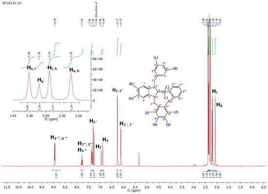 Bis-[1-(3,5-dimethylbenzyl)-5,6-dimethyl-3-(2,3,4,5,6–pentamethylbenzyl)benzimidazoliN-2-ylidene] palladium (IV) dichloride (2a). Yield: 87 (%). M.p. = 233 °C. FT-IR (KBr) ν, cm−1: 3062 (C-Harom); 1445 (C-N); 1H-NMR (CDCl3) δ (ppm): 7.24 (s, 2H, H14, 14′, arom. CH); 7.07 (s, 2H, H12, 16, arom. CH); 6.92 (s, 1H, H12′, arom. CH); 6.83 (s, 1H, H16′, arom. CH); 6.73 (s, 2H, H4,7, arom. CH); 6.28 (s, 2H, H4′, 7′, arom. CH); 6.16 (s, 2H, H17, CH2); 6.02 (4H, H10, 10′, 2× CH2); 5.88 (2H, H17′, CH2); 2.42 (s, 6H, Hc, d, 2× CH3); 2.31 (s, 6H, Hc′, d′, 2× CH3); 2.28(s, 3H, Hg, CH3); 2.25 (s, 3H, Hg′, CH3); 2.22 (s, 12H, Ha, b, a′, b′, 4× CH3); 2.17 (s, 6H, He, i, 2× CH3); 2.15 (s, 12H, Hf,h,f′,h′, 4× CH3); 1.98 (s, 6H, He′,i′, 2× CH3). 13C-NMR (CDCl3) δ (ppm): 180.89 (NCN (C2,2′); 138.11–137.76 (arom. Cq (C8,9,8′,9′)); 136.09–135.90 (arom. Cq (C13,15,13′,15′); 135.34–135.12 (arom. Cq (C11,11′); 134.29 (arom. Cq (C18′,18); 133.16 (arom. Cq (C21,21′); 132.87–132.64 (arom. Cq (C20,22,20′,22′); 131.16 (arom. CH (C14,14′); 129.12–128.91 (arom. CH (C12,16,12′,16′); 125.41 (arom. Cq (C19,23,19′,23′); 125.18 (arom. Cq (C5,6,5′,6′); 112.37 (arom. CH (C4,7,4′,7′); 51.50 (CH2 (C10,10′); 50.86 (CH2 (C17,17′);16.82 (CH3 (Ce,i,e′,i′); 17.13 (CH3 (Cf,h,f′,h′); 17.57 (CH3 (Cg,g′); 20.46 (CH3 (Ca,b,a,b′); 21.05 (CH3 (Cc,d,c′,d′). (DART-TOF-MS) = (m/z = 732.32). Anal. Calc. for C60H74N4PdCl2: C, 70.062%; H, 7.252%; N, 5.447%, Found: C, 70.1; H, 7.3; N, 5.6%.