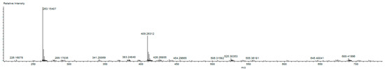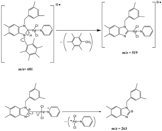 The obtained fragments are typical for each palladium bis-N-heterocyclic carbene complexes 2a–c and palladium PEPPSI-type complexes 3a–c and can provide further evidence for the characterization of the examined compounds. The MS spectrum of complex 3a is given in Figure 5.