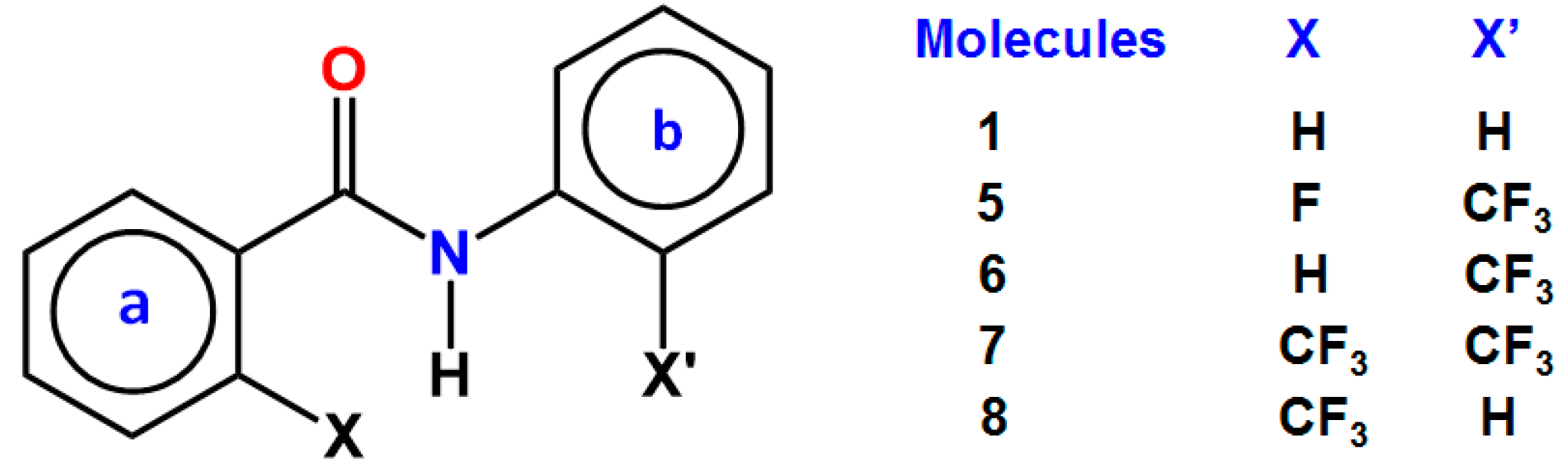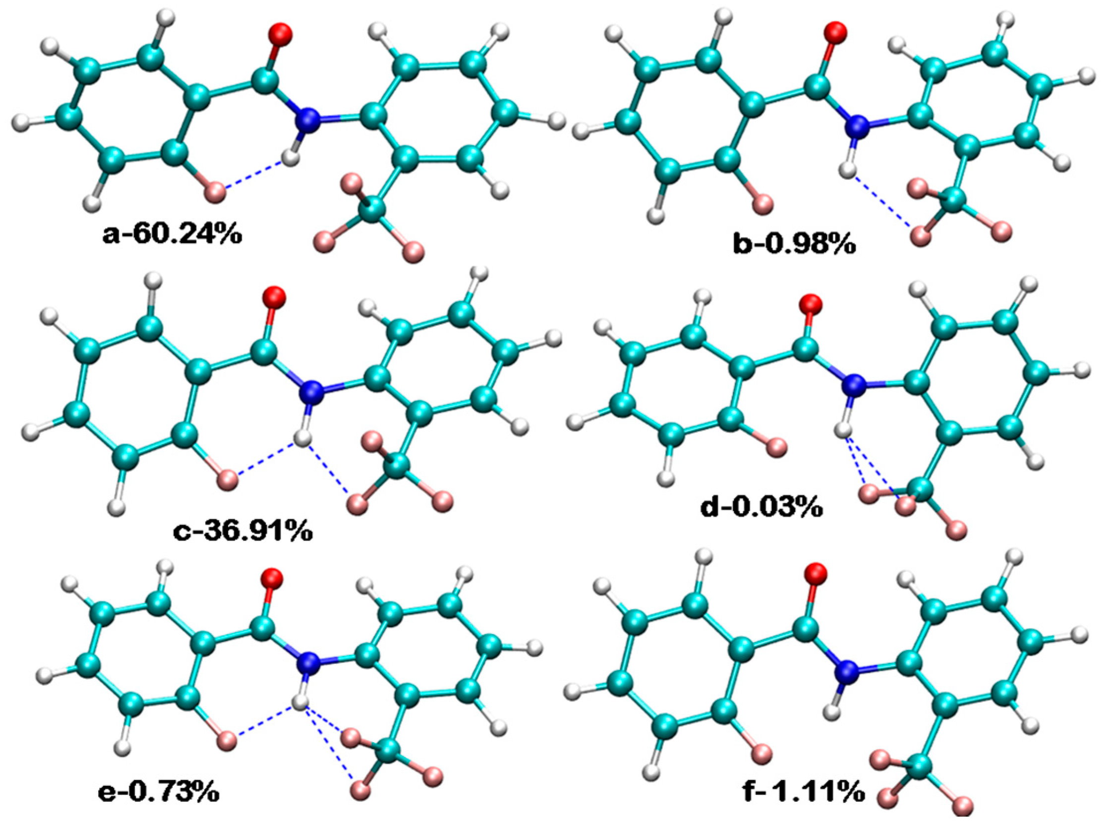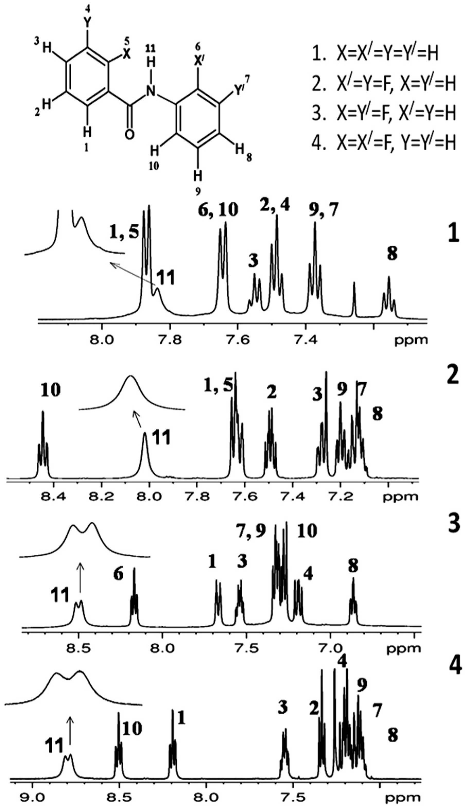 - Reddy, G.N.M.; Vasantha Kumar, M.V.; Guru Row, T.N.; Suryaprakash, N. N–H…F hydrogen bonds in fluorinated benzanilides: NMR and DFT study. Phys. Chem. Chem. Phys. 2010, 12, 13232–13237. [Google Scholar] [CrossRef] [PubMed]