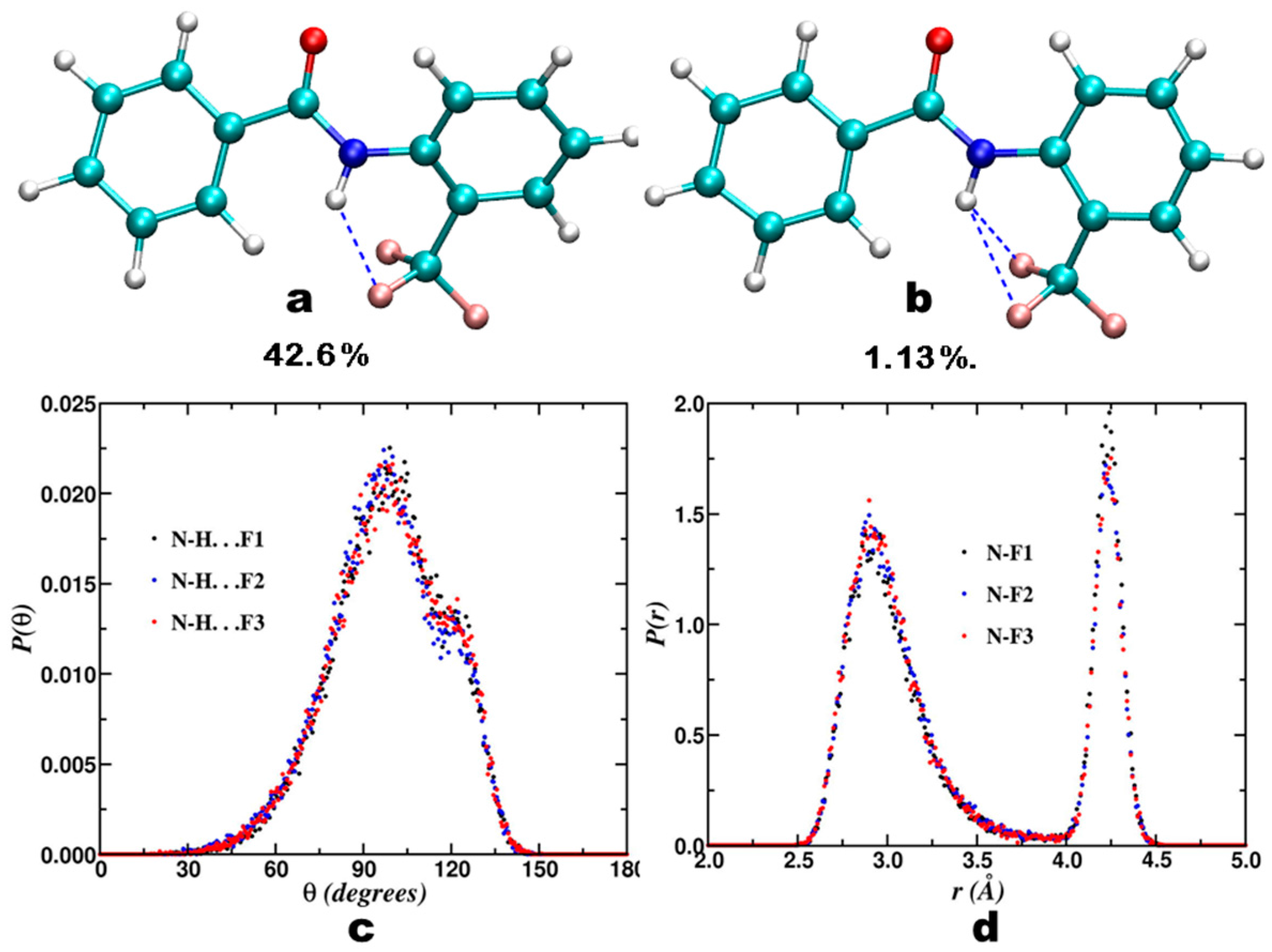 - Chaudhari, S.R.; Mogurampelly, S.; Suryaprakash, N. Engagement of CF3 Group in N−H···F−C Hydrogen Bond in the Solution State: NMR Spectroscopy and MD Simulation Studies. J. Phys. Chem. B 2013, 117, 1123–1129. [Google Scholar] [CrossRef] [PubMed]