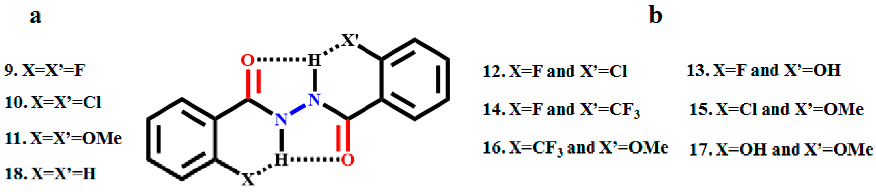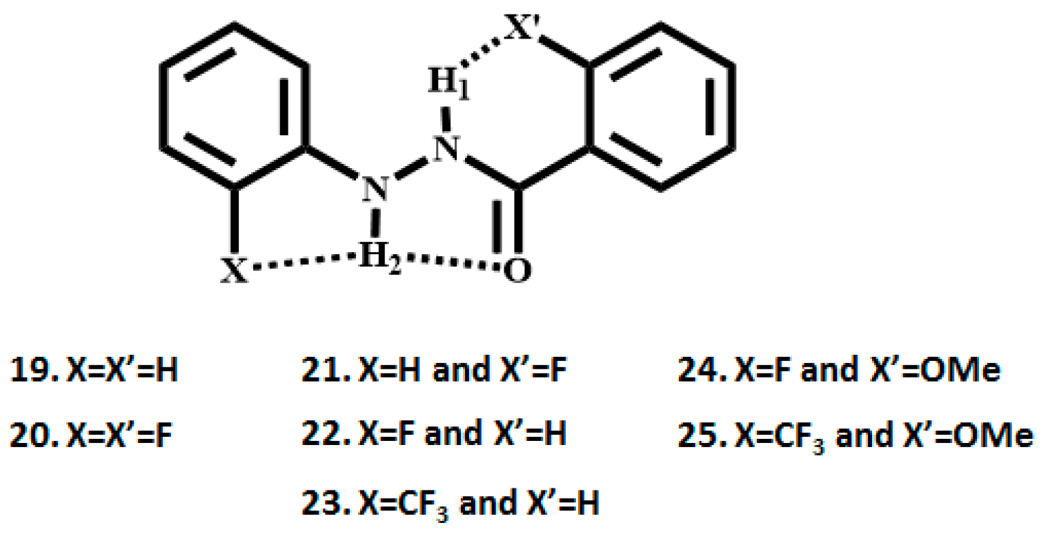 - Lakshmipriya, A.; Suryaprakash, N. Two- and Three-Centered Hydrogen Bonds Involving Organic Fluorine Stabilize Conformations of Hydrazide Halo Derivatives: NMR, IR, QTAIM, NCI, and Theoretical Evidence. J. Phys. Chem. A 2016, 120, 7810–7816. [Google Scholar] [CrossRef] [PubMed]