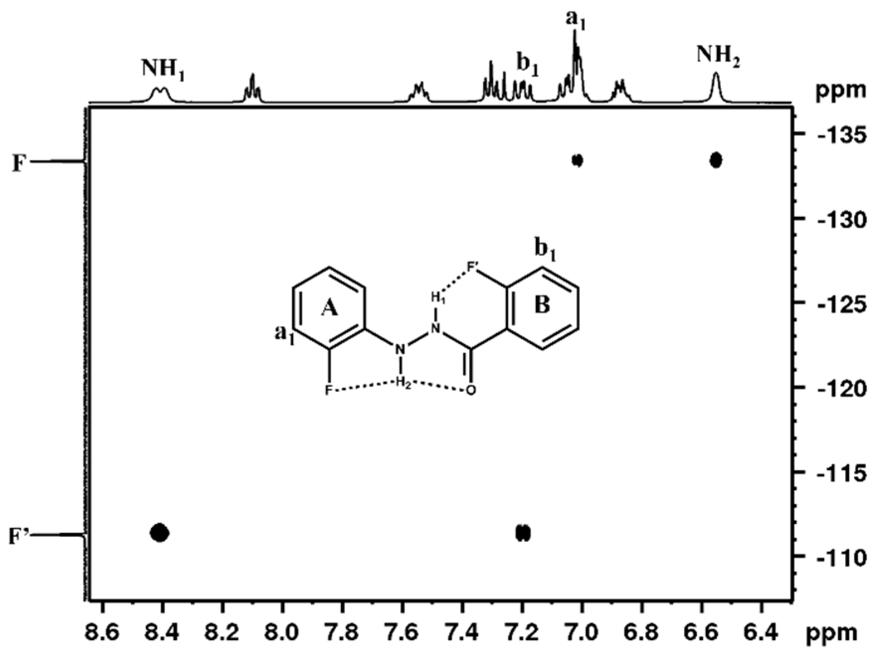 - Divya, K.; Hebbar, S.; Suryaprakash, N. Intra-molecular hydrogen bonding with organic fluorine in the solution state: Deriving evidence by a two dimensional NMR experiment. Chem. Phys. Lett. 2012, 525–526, 129–133. [Google Scholar] [CrossRef]