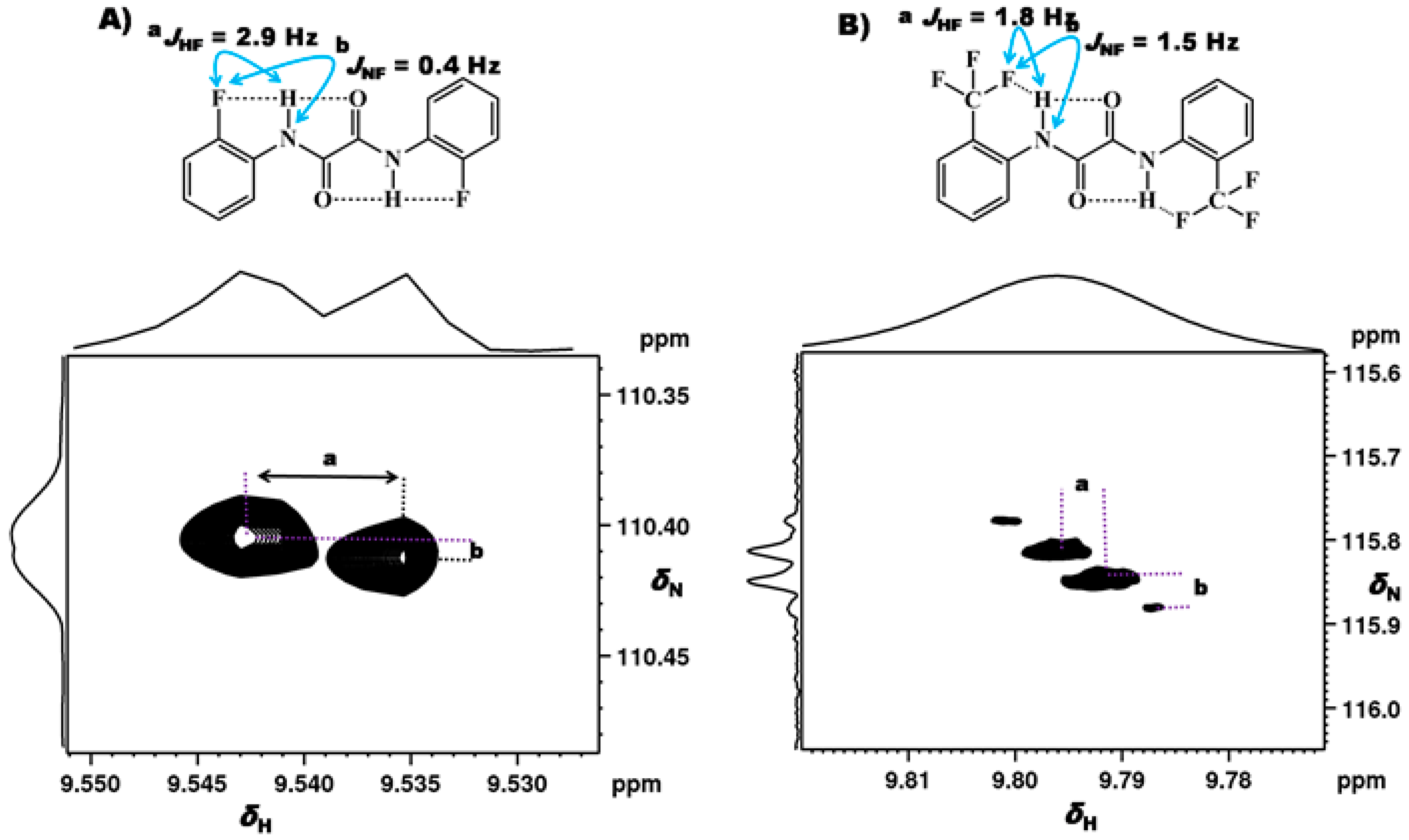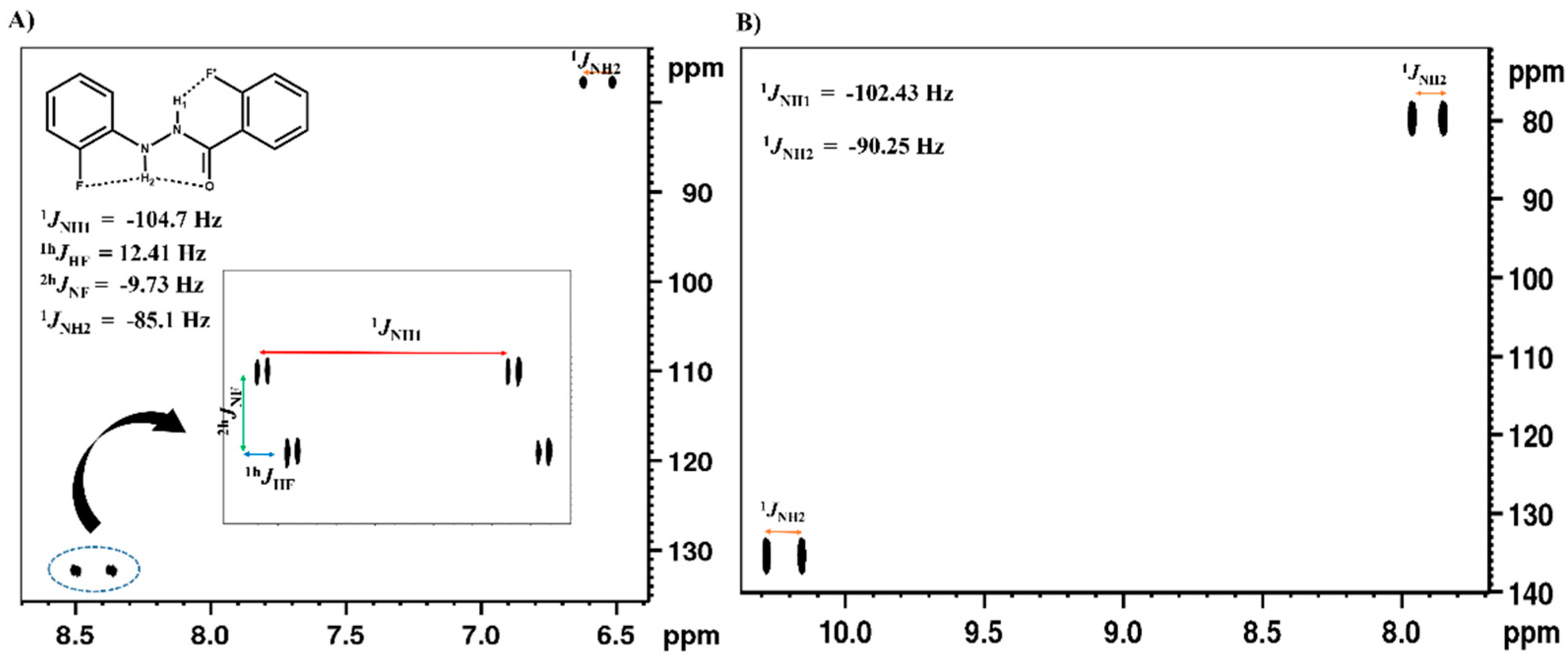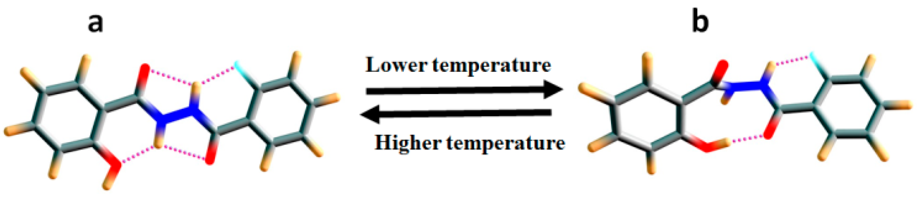 - Mishra, S.K.; Suryaprakash, N. Intramolecular hydrogen bonds involving organic fluorine in the derivatives of hydrazides: an NMR investigation substantiated by DFT based theoretical calculations. Phys. Chem. Chem. Phys. 2015, 17, 15226–15235. [Google Scholar] [CrossRef] [PubMed]