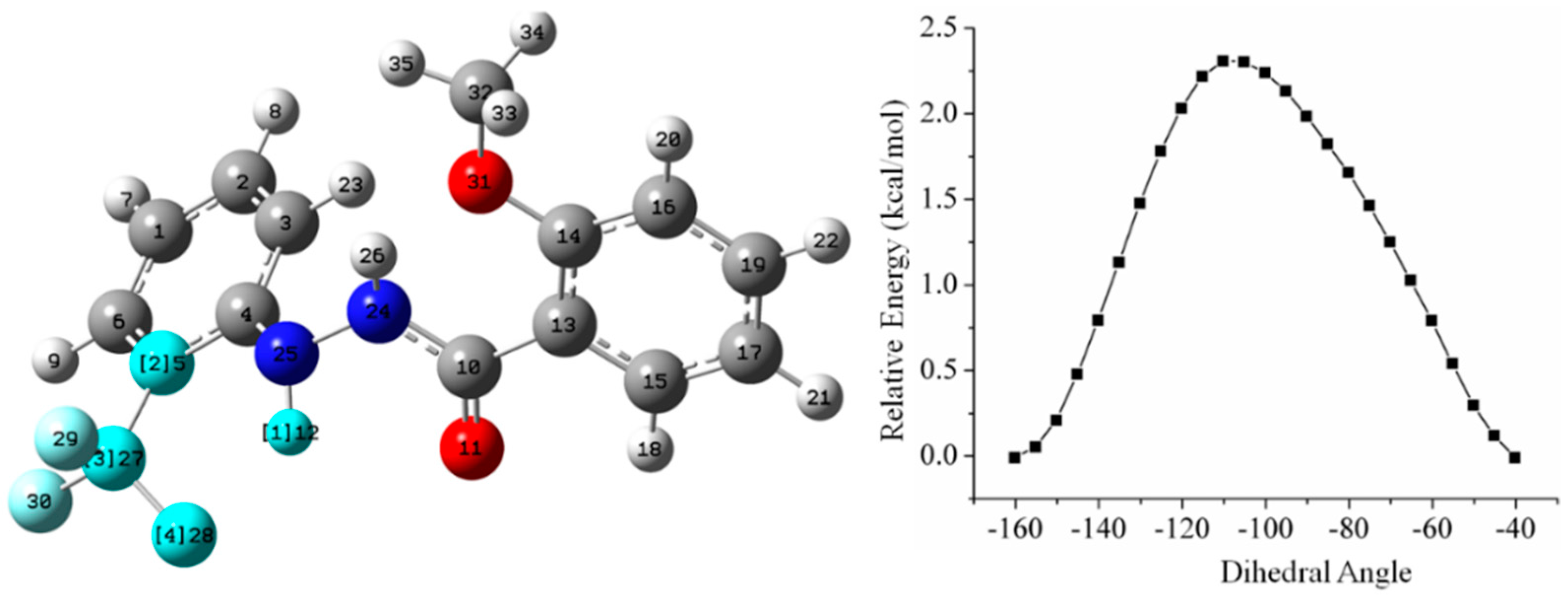 - Frisch, M.J.; Trucks, G.W.; Schlegel, H.B.; Scuseria, G.E.; Robb, M.A.; Cheeseman, J.R.; Scalmani, G.; Barone, V.; Mennucci, B.; Petersson, G.A.; et al. Gaussian G09; Gaussian, Inc.: Wallingford, CT, USA, 2009. [Google Scholar]