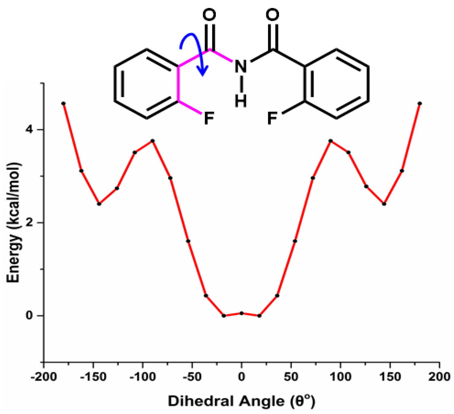 - Galan, J.F.; Brown, J.; Wildin, J.L.; Liu, Z.; Liu, D.; Moyna, G.; Pophristic, V. Intramolecular Hydrogen Bonding in ortho-Substituted Arylamide Oligomers: A Computational and Experimental Study of ortho-Fluoro- and ortho-Chloro-N-methylbenzamides. J. Phys. Chem. B. 2009, 113, 12809–12815. [Google Scholar] [CrossRef] [PubMed]