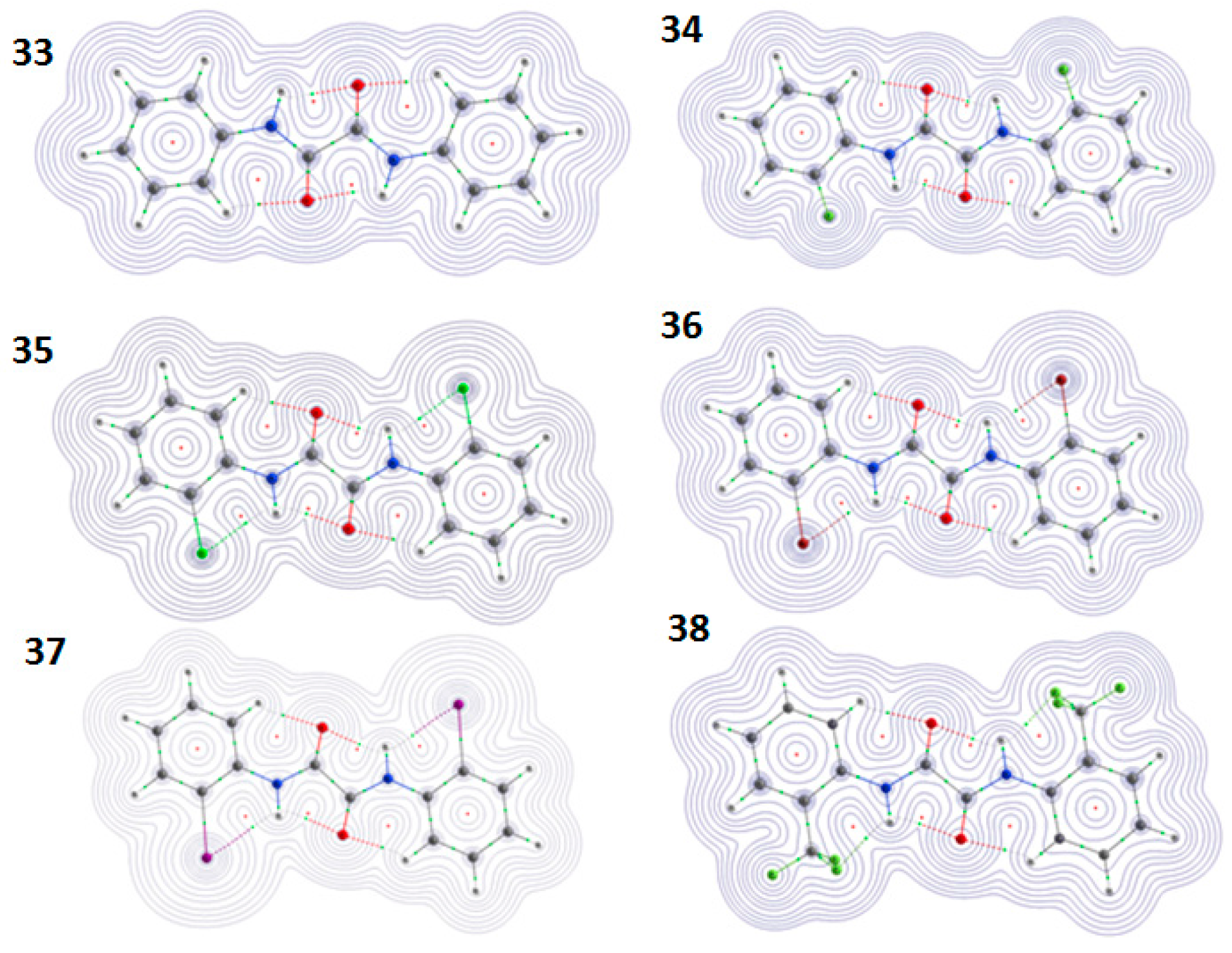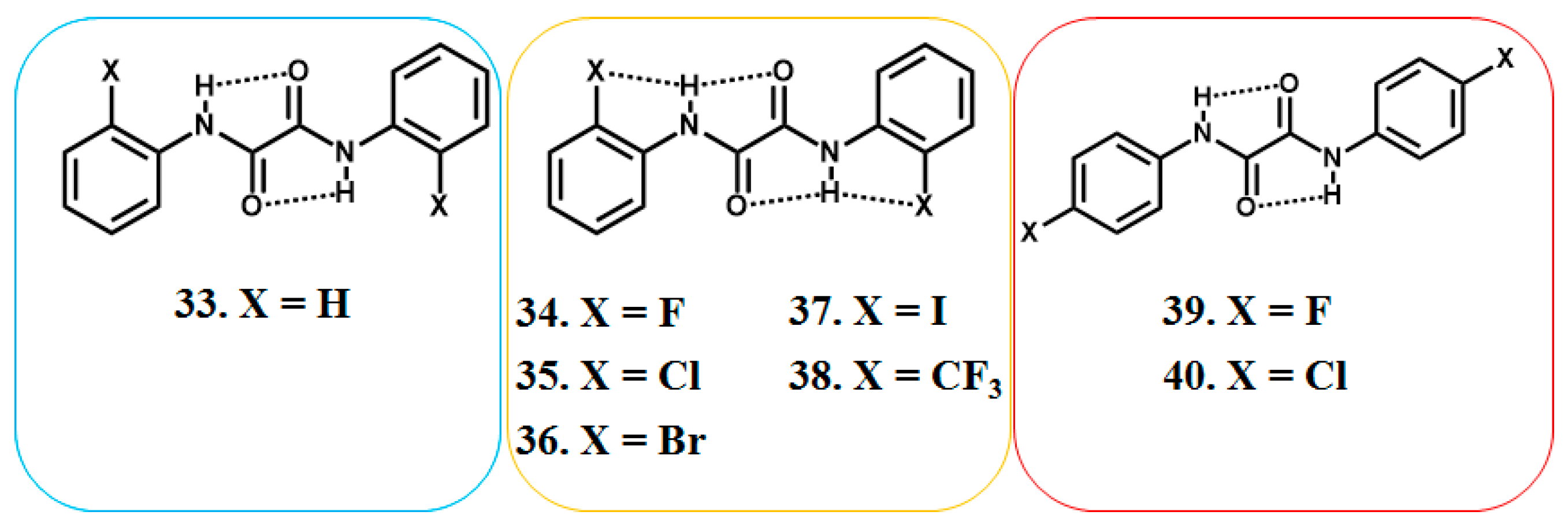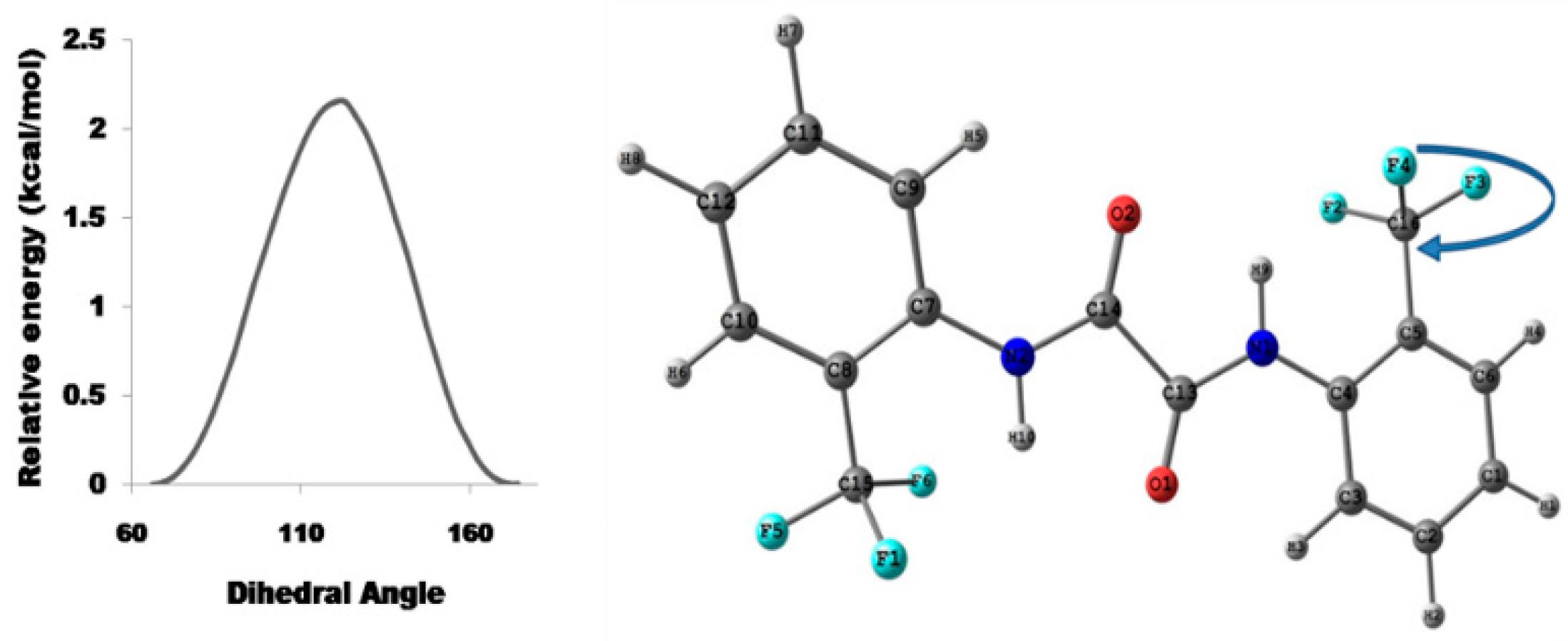 - Lakshmipriya, A.; Chaudhari, S.R.; Shahi, A.; Arunan, E.; Suryaprakash, N. Three centered hydrogen bonds of the type C-O…H(N)…X–C in diphenyloxamide derivatives involving halogens and a rotating CF3 group: NMR, QTAIM, NCI and NBO studies. Phys. Chem. Chem. Phys. 2015, 17, 7528–7536. [Google Scholar] [CrossRef] [PubMed]