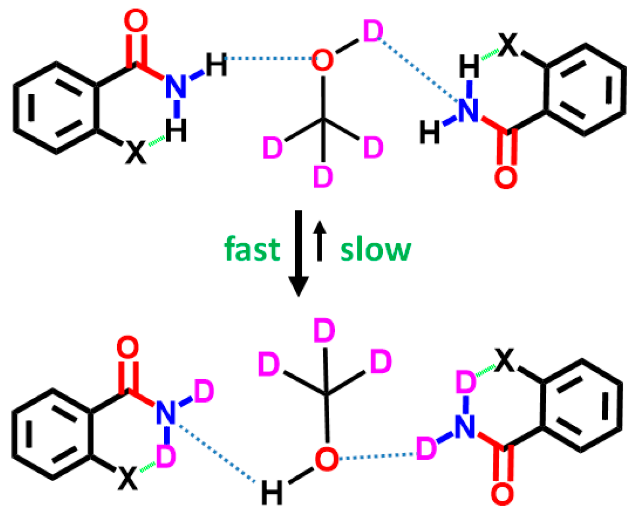 - Mishra, S.K.; Suryaprakash, N. Study of H/D exchange rates to derive the strength of intramolecular hydrogen bonds in halo substituted organic building blocks: An NMR spectroscopic investigation. Chem. Phys. Letts. 2015, 639, 254–260. [Google Scholar] [CrossRef]