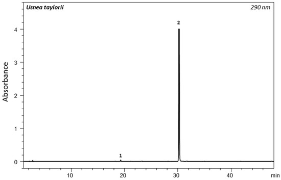 PDA chromatogram at 290 nm of U. taylorii acetone extract. Identified compounds are: (1) fumarprotocetraric acid (traces) and (2) usnic acid.
