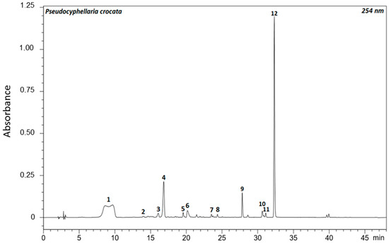 PDA chromatogram at 254 nm of P. crocata acetone extract. Identified compounds are (1) constictic acid; (2) cryptostictic acid; (3) Pc3; (4) stictic acid; (5) norstictic acid; (6) pulvinic acid; (7) gyrophoric acid; (8) pulvinamide; (9) 4-O-methylgyrophoric acid; (10) calycin; (11) Pc11; and (12) tenuiorin.