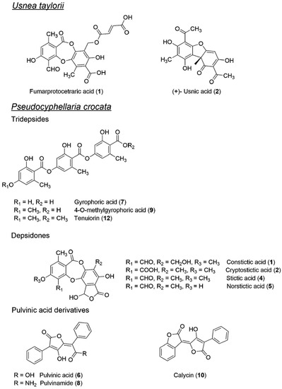 - Ingolfsdottir, K. Usnic acid. Phytochemistry 2002, 61, 729–736. [Google Scholar] [CrossRef]