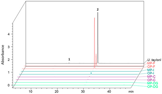 PDA chromatogram at 290 nm of acetone extracts of N. hookeri digestive gland (DG, green curves), crops (C, purple curves), intestines (I, blue curves), and feces (F, red curves) after being fed with U. taylorii (black curve). These profiles are compared according to their phenotype (MP = mineral, PBAS sample; OP = organic, MAS sample).