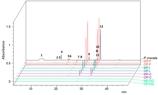 254-nm PDA chromatograms obtained from P. crocata and the biological compartments of N. hookeri fed on this species are collated in Figure 5.