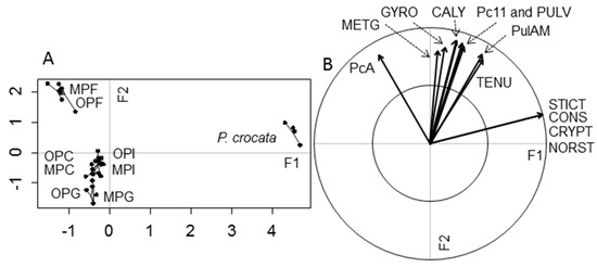 Graphs of the Partial Least Square-Discriminant Analysis (PLS-DA) performed on the specialized metabolites of the lichen Pseudocyphellaria crocata. (A) is the score plot obtained on the two first axes (F1, F2) that explain 94.50% of the constrained variances; (B) is the corresponding loading plots of specialized metabolites. The cross-model validation used for the discrimination of the lichen parts (8 components, 999 permutations, NMC = 0.668; p = 0.004) indicated statistically different biochemical profiles. The samples are crop (C), intestine (I), digestive gland (G), and feces (F) of organic (OP) and mineral (MP) phenotypes. The metabolites are constictic (CONS), cryptostictic (CRYPT), stictic (STICT), norstictic (NORST), pulvinic (PULV), gyrophoric (GYRO), and 4-O-methylgyrophoric (METG) acids, calycin (CALY), and pulvinamide (PulAM), Pc11 detected in the lichen but unidentified, and the unidentified PcA that only arose in the snail gut.