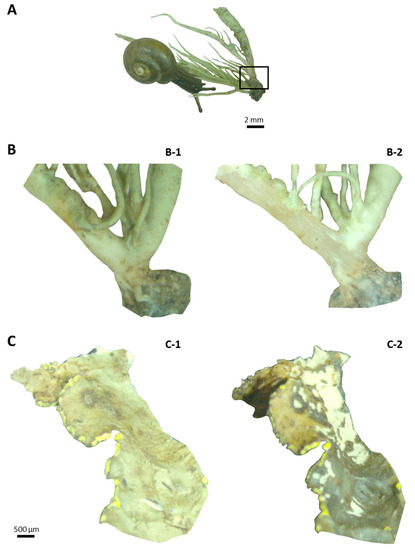 The role of bacteria in detoxification cannot be considered in snails because they are hindgut fermenters that harbor intestinal bacteria [31]. Although usnic acid could be detected in the different gut compartments, the concentration of this dibenzofuran derivative in the feces was shown to be about seven times as much as in the intestine. By comparison to the lichen, the OP-snail feces were enriched in usnic acid by a three-fold factor. It is assumed that focal environmental variations might favor adaptation to local conditions for nested populations such as N. hookeri that is restricted to focal habitats owing to its poor dispersal activity [15]. We hypothesized that the snail was able to sequestrate usnic acid in the digestive gland, since this organ is involved in the production of digestive enzymes [32], hydrogen production, nutrient absorption [33] and excretion [34]. Regarding this specific example, our hypothesis was invalidated because of the low levels of usnic acid found in the digestive gland (Figure S11). Therefore, it seems that snails usually feeding on U. taylorii might have acquired the ability to eliminate usnic acid by active transport. Conversely, fumarprotocetraric acid could not be detected from any gut compartment. The observation of the consumed U. taylorii thalli revealed that N. hookeri only fed on the superficial cortex of the lichen, while the bulk of fumarprotocetraric acid is contained in the medulla (Figure 8B) [35]. Therefore, this depsidone may not be ingested by N. hookeri, while usnic acid is consumed because of its accumulation in the cortical layers of the lichens [36]. One can also imagine that the minute amounts of fumarprotocetraric acid encountered in U. taylorii precluded its detection from the biological samples.