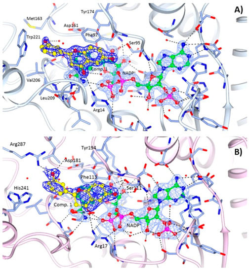 TbPTR1-NADP+-1 complex. The structure was determined at 1.70 Å resolution. Ligand placement and key interactions within the active site cavity are reported in Figure 3A. The chroman-4-one moiety of compound 1 is involved in a π-sandwich between the nicotinamide of NADP+ and Phe97, and the ether O1 points towards the side chains of Asp161 and Tyr174. The hydroxyl group in position 6 establishes a H-bond with the oxygen atom O2A of NADP+ β-phosphate and a weaker one (3.45 Å) with the Ser95 side chain. The carbonyl group in position 4 is H-bonded to the amino group of Arg14 and linked to the oxygen atom (O2A) of the cofactor through a water molecule. The phenol linked to position 2 of the chroman-4-one is located in a prevalently hydrophobic pocket lined by Met163, Val206, Leu209, Met213, Trp221 and Leu263, and is able to make a T-shaped stacking interaction with the side chain of Trp221 and a water-mediated interaction with the side chain of Asp161. Even though the soaking procedure was performed using a racemic mixture only the R-enantiomer has been observed in the active site cavity (no evidences for the S-enantiomer in the electron density map as shown in Figure 3A).