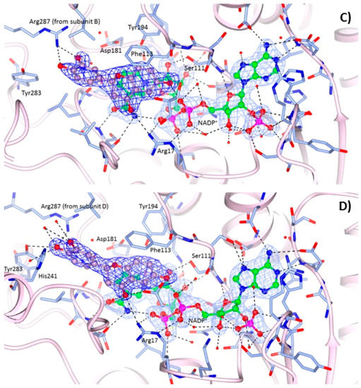 LmPTR1-NADP+-1 and LmPTR1-NADP+-3 complexes. The structures have been determined at 2.35 Å and 2.10 Å resolution, respectively. The orientations of compounds 1 (Figure 3B) and 3 (Figure 3C,D) in the catalytic pocket of LmPTR1 resemble that of compound 1 in the TbPTR1 active site (Figure 3A). Moreover, as reported above for the complex with TbPTR1, only the R-enantiomer of the compounds has been observed within the catalytic cavity of LmPTR1. The chroman-4-one scaffold establishes a π-sandwich between the nicotinamide of NADP+ and Phe113 and most of the interactions with the surrounding residues are retained across the two species: the hydroxyl group in position 6 of both compounds is located within H-bonding distance of the β-phosphate oxygen atom O2A of NADP+, and Ser111 side chain. Compound 1 is also able to establish a polar contact with the Ser111 side chain (Figure 3B). In both compounds, the carbonyl group in position 4 is H-bonded to the NH2 group of Arg17. As in TbPTR1, the phenol moieties are located in a prevalently hydrophobic pocket lined by Leu188, Leu226, Leu229, His241 and Arg287 (for clarity, leucine residues are not labelled in Figure 3B–D). The phenol ring of compound 1 is able to establish a strong H-bond with the Arg287 side chain, which points into the catalytic pocket from an adjacent subunit of the tetramer, and a water-mediated interaction with Asp181. In the complex LmPTR1-3, the involvement of the m-hydroxyl group of the catechol ring in the interaction with the NH2 group of Arg287 is visible only in chains C and D (Figure 3C), whereas in chains A and B (Figure 3D), due to a flip of the catechol ring of about 120°, the p-hydroxyl group interacts with the side chain of Tyr283.