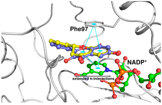 The crystal structures of TbPTR1 and LmPTR1 show almost identical binding modes for compound 1 (Figure 3A,B). Interestingly, compound 1 is about twice as potent against TbPTR1 as against LmPTR1 (IC50 TbPTR1 = 31 µM, LmPTR1 = 57 µM). The LmPTR1 binding pocket is smaller than the TbPTR1 pocket, since one residue from the neighboring subunit, which is pointing into the active site, namely Arg287 of LmPTR1, is replaced by the smaller His267 in TbPTR1. In LmPTR1, ring B is in close proximity to Arg287 and adopts a slightly different orientation allowing a hydrogen bond between 3′-OH and Arg287 to be formed. Notably, in TbPTR1, no direct interaction with His267 is possible and the 3′-OH can only interact with a fully conserved water molecule, and ring B is stabilized by a T-shaped stacking interaction with Trp221. The corresponding His241 of LmPTR1 does not allow a similar stabilizing interaction. We conclude that the gating role of Trp221 in TbPTR1, leading to a more closed pocket, is favorable for activity. The LmPTR1 pocket remains more open and more accessible for bulk water; the placement of a hydrophobic ligand moiety in a solvent-exposed environment could affect the binding of compound 1 to LmPTR1, leading to the lower affinity. The binding modes of compound 1 and flavonol 1A are almost identical. Nevertheless, compound 1A is about eight-fold more active against TbPTR1 than compound 1 (IC50 TbPTR1 4.3 and 31.0 µM, respectively). As shown in Figure 4, both the chromanone of compound 1 and the chromenone of compound 1A occupy the stacking position between Phe97 and the cofactor nicotinamide. Compound 1A can form extended aromatic interactions with the π-system of the cofactor; on the contrary, only the aromatic ring A of compound 1 can interact in a similar manner, while ring C contributes solely to hydrophobic stabilization. Moreover, ring C is located in proximity of the rather polar carboxyamide group of NADP+, which may further explain why the binding of a chromanone (compound 1) is less favorable than that of a chromenone (compound 1A). This difference in activity is also observed in LmPTR1 (IC50 LmPTR1 compound 1A: 12.5 µM and compound 1: 57.0 µM).