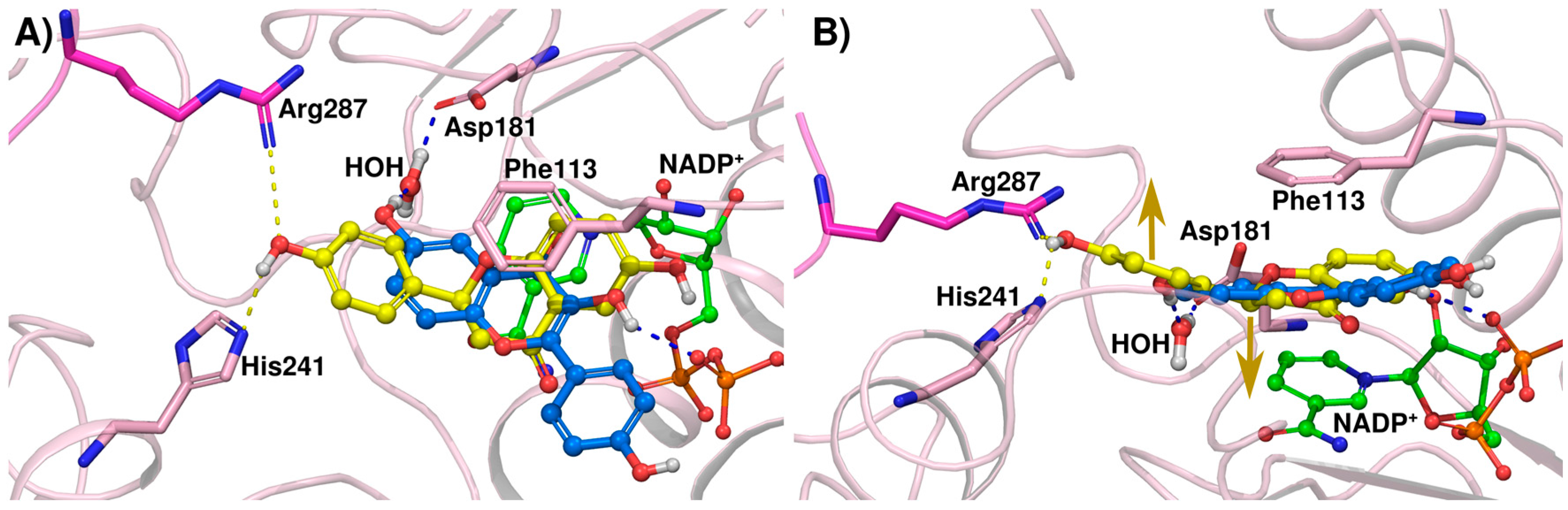 Figure 5. (A) Docking poses of compound 2 (ball-and-stick, yellow carbons) and 2A (blue carbons) in LmPTR1 (pink cartoon with Arg287 from the neighboring subunit shown in magenta sticks; NADP+ cofactor in ball-and-stick with green carbons). Interactions are indicated as dashed lines colored according to the interacting compounds’ carbon color. Interacting residues are shown in stick representation; (B) As (A) but rotated by approx. 90°. The yellow arrows indicate the kink in the ligand that is introduced by the chromanone ring system.