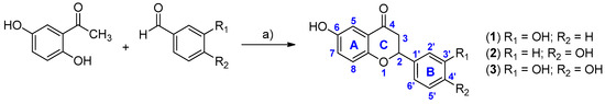 Previously [14], we had synthesized a library of 16 flavonols and compound 1A turned out to be the most potent TbPTR1 inhibitor. In the present work, we designed and synthesized compounds 13, analogues of 1A3A respectively, in order to compare the binding modes and the affinities of flavanones with those of flavonols. Compounds 13 were synthesized by condensation between substituted acetophenone and benzaldehydes in the presence of thionyl chloride in ethanol, as previously reported (Scheme 1) [21]. The compounds were characterized by 1H-NMR, 13C-NMR and mass analysis and the data are reported in the Supporting Information (p. S2).