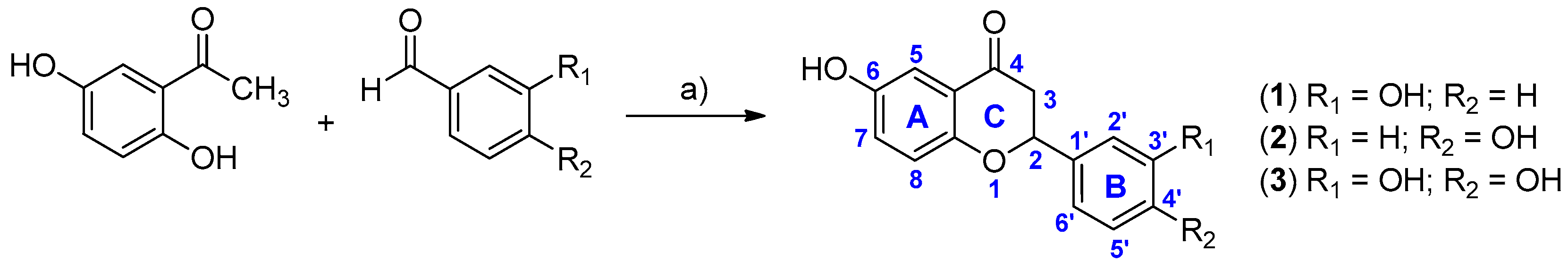 To a stirred mixture of 2′,5′-dihydroxyacetophenone (0.30 g, 1.97 mmol) and the appropriate aldehydes (1 eq.) in absolute ethanol (2 mL), thionyl chloride (120 µL) was added dropwise over 5 min. The reaction was stirred at room temperature for 6 h. Ethanol and excess of thionyl chloride were removed under reduced pressure on a rotary evaporator. Column chromatography was carried out to purify the desired product (eluent system: cyclohexane/ethyl acetate 9.8/0.2).