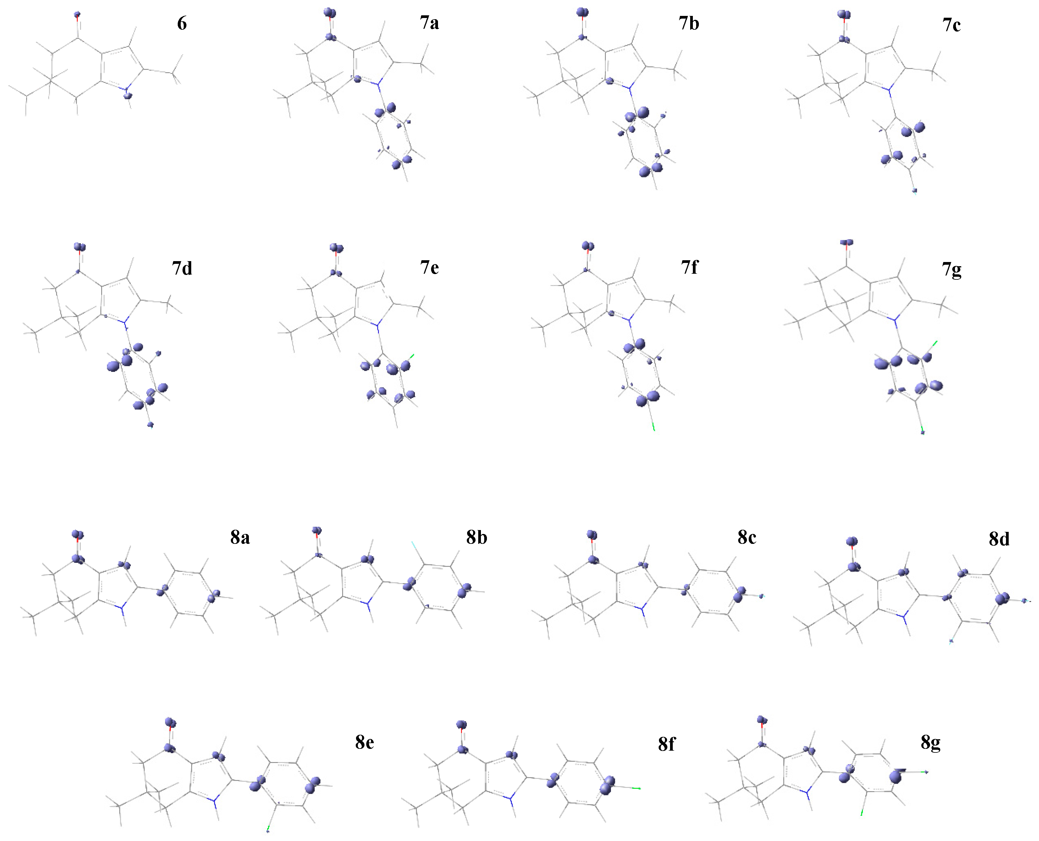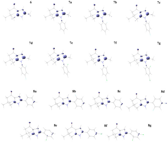 Fukui function isosurface plots for a nucleophilic attack of series I (6, 7a–g) and II (8a–g) of compounds. In purple color (positive values) are the favorable sites for a nucleophilic attack; cutting value 0.01 a.u.