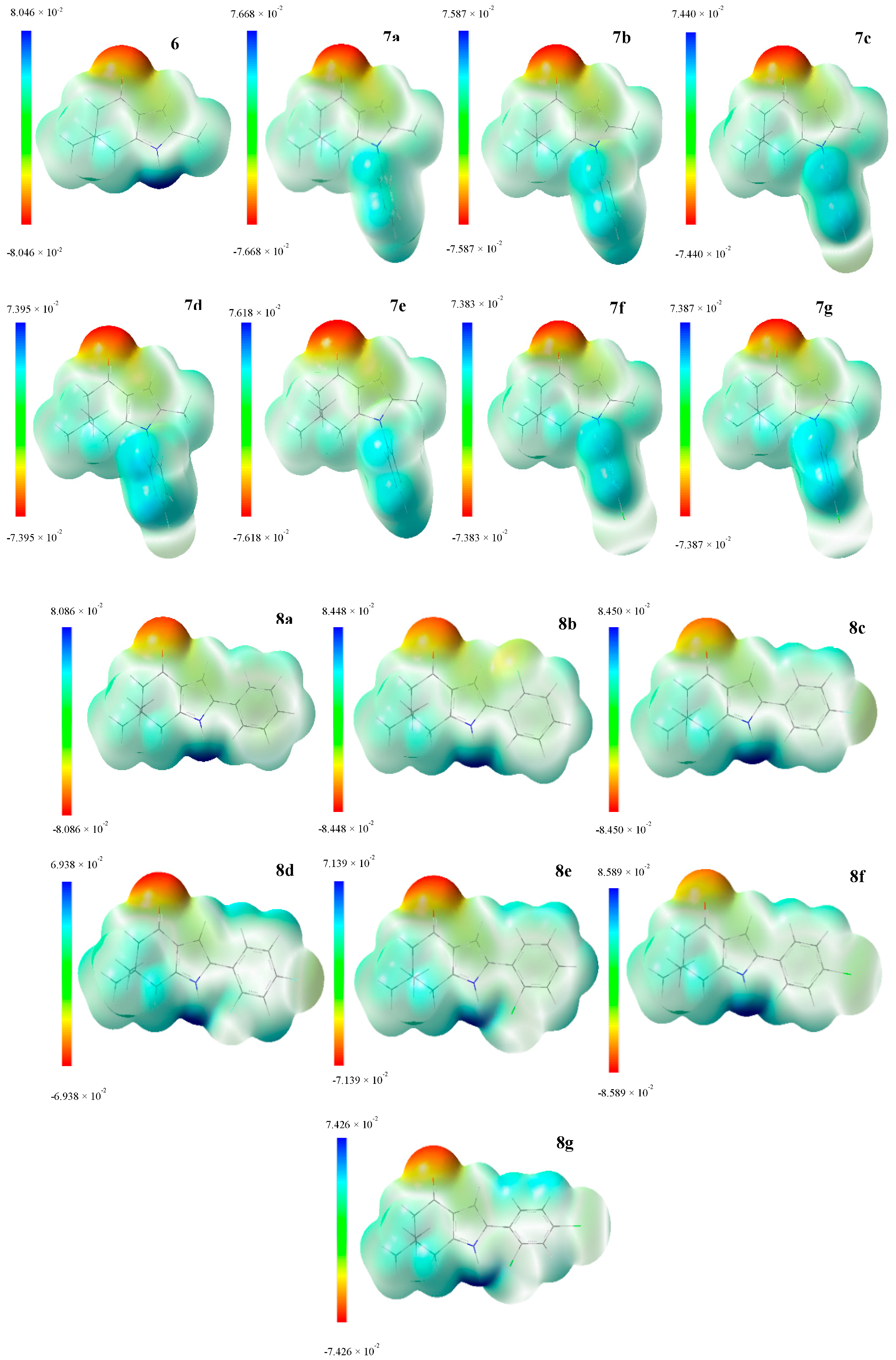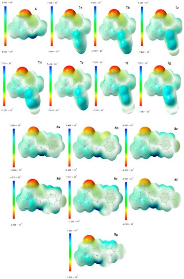 Molecular electrostatic potential maps from series I (6, 7a–g) and II (8a–g). This chart shows regions with negative values (red), and positive values (blue). The color code is different range depending of the structure; units are given in a.u. for each scale.