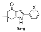 Recently, González et al. designed and synthesized a series of novel indol-4-one derivatives with 1- and 2-(2,4-substituted phenyl) side chains (Figure 1). These compounds were tested in vitro against eight human pathogenic filamentous fungus and yeast strains by determination of the minimal inhibitory concentration (MIC); as MIC decreased, the antifungal activity increased. Based on their results, they reported activity against Candida tropicalis, Candida guilliermondii and Candida parapsilosis at MIC values of 0.0316 mM (8 µg·mL−1) for compounds 8a–g; and MIC values of 0.1014 mM (31.25 µg·mL−1) against Aspergillus fumigatus (Table 1) for compounds 7a–g. A change in the position of the halophenyl regioisomers from N-1 to C-2 increased the antifungal activity. It was the first report about antifungal activity for these indol-4-one derivatives.