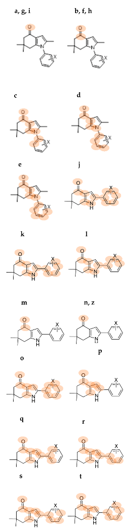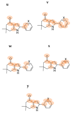 For series II, C. albicans has the higher correlation values for ωk−; the addition of carbon atom to oxygen atom to obtain the carbonyl group keeps the correlation for ωk− (see fragments m, r = 0.92 and n, r = 0.92). Fragments that include the nitrogen atom of the pyrrole ring do not increase the correlation value when increasing the number of carbon atoms of the phenyl ring (j, k and l, r = 0.75). The addition of the pyrrole ring, ipso carbon atom, and the meta-C atom from the phenyl ring, improves the correlation (q, r = 0.86). For other species, linear regressions with higher r were found when oxygen was included in ωk0: C. krusei 48 h (r = 0.78), C. tropicalis 24 h (r = 0.78), C. guilliermondii 48 h (r = 0.76), and C. parapsilosis 24 h (r = 0.78).