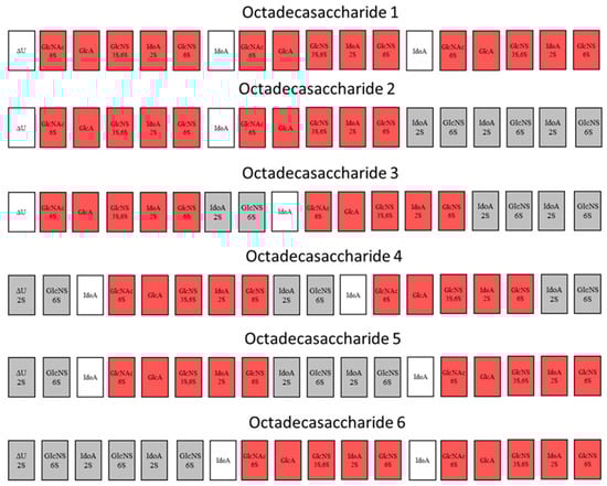 Studied octadecasaccharides (in red saccharide units from AGA*IA sequence). In grey, flanking saccharide units are represented. In white, additional uronic acid present in the minimal natural sequence.