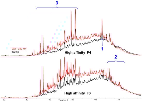 Cetyltrimethylammonium strong anion exchange (CTA-SAX) chromatograms of octadecasaccharide fractions F3 and F4: 1-triple site, 2-double sites, 3-glycoserine octadecasaccharides.