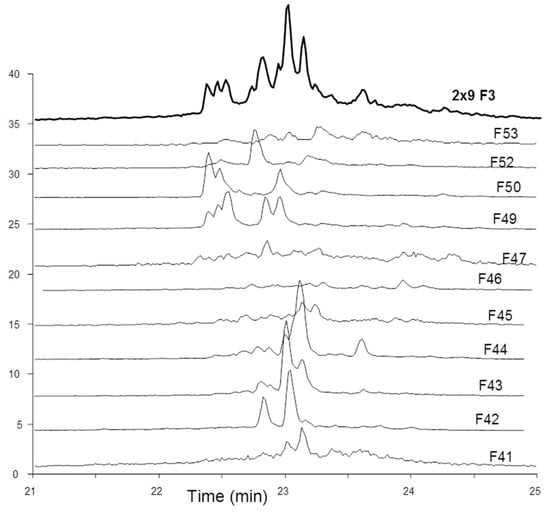 LC/MS reconstructed ion mass chromatograms of initial fraction F3 and sub fractions of interest corresponding to MW 4957 Da (m/z 2430.2: (4957 + 23 × HXA + 2H)3+).