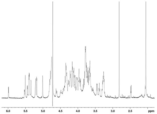 The 1H-NMR spectrum of the octasaccharide 6 is shown in Figure 5. Proton and carbon resonances of each residue were assigned using COSY (correlation spectroscopy), TOCSY (total correlation spectroscopy) and HSQC (heteronuclear single quantum coherence spectroscopy) pulse sequences (Table 4) (octadecasaccharides 2, 3, 4 and 5 structural assignments are reported in the Supplementary Data).