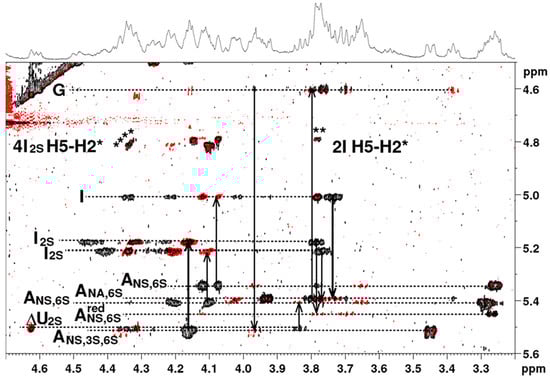 A total of 18 proton signals were observed in the anomeric region between 5.55 and 4.55 ppm, indicating that the polysaccharide is an octadecasaccharide, with only 13 different chemical shifts. As a consequence, the proton spectrum did not appear as complex as might be expected for an octadecasaccharide. This feature indicated the presence of two repeating units in the sequence of the octadecasaccharide, with many resonance superimpositions. Chemical shift analysis was compatible with a composition including nine α-d-glucosamines, six α-l-iduronic acids, two β-d-glucuronic acids (anomeric proton resonance observed between 5.53 and 5,34 ppm, 5.22 and 5.01 ppm and at 4.60 ppm, respectively), and one 4,5-unsaturated uronic acid. Two central acetyl signals are visible at 2.05 ppm. The Ci-H1 to C(i+1)-H4 connectivity, observed in the nuclear Overhauser spectroscopy (NOESY) experiment, were used for monosaccharides sequence determination (Figure 6). The well-resolved resonance of H4-ΔU uronic acid was used as the assignment starting point. The presence of N-sulfate or N-acetyl on α-d-glucosamine residues, and the presence or absence of O-sulfate groups, was deduced from 1H and 13C chemical shifts.