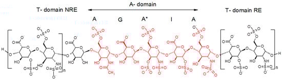 In their previous work [19,21], Petitou et al. introduced the concepts of A domain (AT binding domain AGA*IA) and thrombin binding domain (T domain) for their synthetic heparin mimetics. At that time, pure natural structures were not available and therefore, hypotheses had to be made to figure out the AGA*IA flanking oligosaccharides, which might constitute the T domain. Their structure-activity studies showed that the T domain should be highly sulfated in order to interact with the positively charged domain of thrombin [19]. Because heparin has some highly sulfated regular regions with repetitive units of trisulfated Is disaccharides, it was therefore presumed that the T domain was an oligomer of this structural motif (Figure 7).