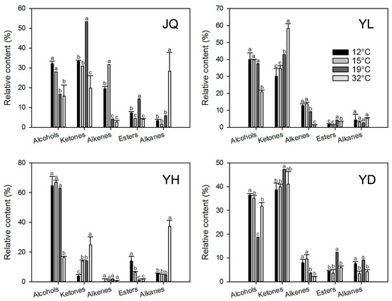 The relative release content of volatile compounds in the floral scent of O. fragrans at different temperature levels was also compared. Different temperatures significantly influenced the relative release content of different compound categories (p < 0.05; Figure 2). Compared to 19 °C, the relative release content of alcohols significantly increased in JQ and YD with the treatments of 12 and 15 °C; however, that in YL and YH was not changed under the treatments of 12 and 15 °C. The relative release content of alcohols with the treatment of 32 °C significantly decreased in YL and YH. Low temperatures of 12 and 15 °C decreased the relative release content of ketones in JQ and YD, but high temperatures of 32 °C reduced the relative release content of ketones in JQ. Similarly, in YL, the relative release content of ketones decreased when the temperature decreased to 12 and 15 °C, but increased when the temperature increased to 32 °C. In YH, the relative release content of ketones did not change with the treatments of 15 °C, but decreased with treatment of 12 °C and increased with treatment of 32 °C. The relative release content of alkenes significantly increased in most cultivars except in YH when the temperature decreased to 12 or 15 °C; however, it decreased in YL or did not change at all in the three other cultivars when the temperature increased to 32 °C. The relative release content of esters decreased whenever the temperature decreased to 12 and 15 °C or increased to 32 °C in JQ, YL, and YD. However, in YH, it increased when the temperature decreased to 12 and 15 °C and did not change at all when the temperature increased to 32 °C. Alkanes in all cultivars were not changed when the temperature decreased to 12 and 15 °C, but they significantly increased in JQ and YH when the temperature increased to 32 °C.