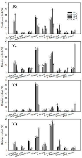 We also investigated the relative release amount of nine main chemical compounds that are beyond 1% in four cultivars of O. fragrans (Figure 3). The same chemical compound showed different changes to the same temperature change in different cultivars. For example, the relative release amount of (Z)-ocimene in most cultivars increased but decreased in YH when the temperature fell to 12 and 15 °C, which decreased in all cultivars with the treatment of 32 °C. Except for YH, the relative release amount of cis-linalool oxide and trans-linalool oxide increased with the fall of temperature to 12 and 15 °C and had no significant change or changed little with the increase in temperature to 32 °C. Only in JQ did the relative release amount of linalool significantly increase when the temperature fell to 12 and 15 °C. When the temperature increased to 32 °C, the relative release amount of linalool showed three different patterns: an increase in YD, a decrease in YL and YH, and no change in JQ. Whenever the temperature increased or decreased, the relative release amount of both α-ionone and β-ionone significantly decreased in all cultivars except for YH. The relative release amount of γ-decalactone significantly decreased in JQ, YL, and YD whenever the temperature increased or decreased; however, that significantly increased in YH whenever the temperature increased or decreased. The relative release amount of epoxy linalool increased in YL and YD when the temperature decreased to 12 and 15 °C, and it increased in JQ and YL with the treatment of 32 °C. The relative release amounts of 2H-β-ionone significantly increased in YL and YH when the temperature increased to 32 °C.