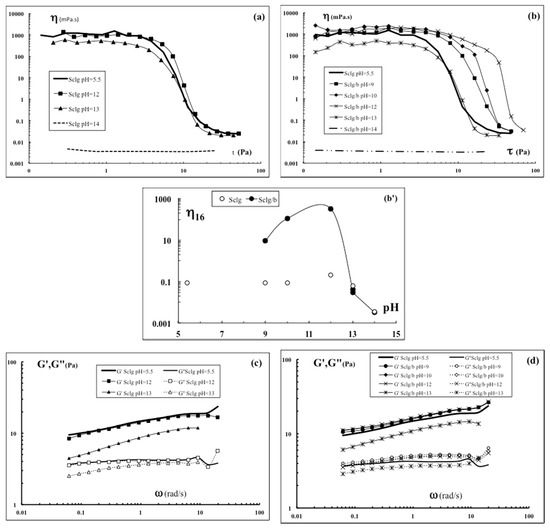 Flow curves of Sclg (a) and Sclg/borax (b) samples at different pH values; (b’): viscosity at stress τ = 16 Pa (η16) for Sclg and Sclg/borax samples at different pH values. Mechanical spectra of Sclg (c) and Sclg/borax (d) at different pH values. In Figure (e), the data for both samples are reported together with the loss modulus G” values recorded at pH = 14 (polymer concentration, cp = 0.7%, T = 25 °C). In Figure (b–e), for an appropriate comparison, the data of Sclg are also shown.