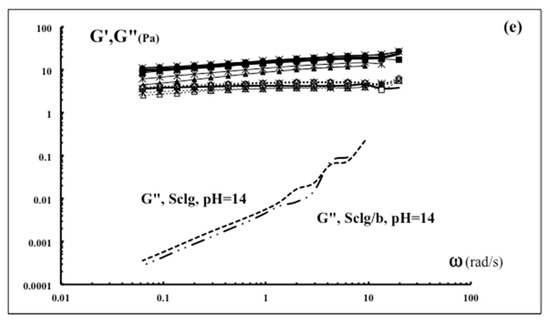 Frequency sweep tests (Figure 1e) confirm that, at pH = 14, regardless of the presence of borax, the storage modulus cannot be detected and only the loss modulus appears due to the breakage of the three-dimensional polymeric network. Additionally, at pH < 14, frequency sweep tests (Figure 1c,d) confirm the weak gel nature of Sclg and Sclg–borax systems, as G’ is always 2–3 times G″ and both of them are slightly dependent on angular frequency ω. Moreover, it can be noted that the addition of borax does not lead to a significant increase of G’ and that, up to pH = 12, all the systems (with and without borax) show very similar behaviours. The mechanical spectra seem to be, at a first glance, in contrast with the flow curves and the stress sweep test, where the effect of borax was always detectable and well evident. However, the overall results from the rheological tests can be explained by taking into account that: