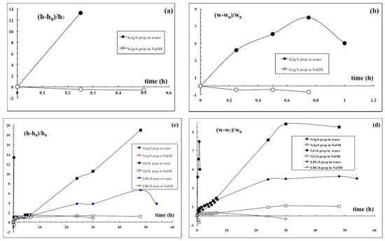 The results, reported in Figure 2, clearly show an interesting behaviour, which differs for the three kinds of tablets. First of all, it must be pointed out that, in all cases, the presence of NaOH reduced significantly both water uptake and elongation in comparison to the data obtained when only distilled water was used for tablet preparations and swelling experiments (see Figure 3 in Reference [13]). In fact, when the polymers were dissolved at high pH values (preparation i) the hydrolysis of glycosidic bonds led to a simultaneous drastic reduction in molecular weights; consequently, the tablets, when soaked in water, showed only a slight water uptake and a slight anisotropic elongation. In the case of Sclg, a mass decrease had already occurred after 15 min, and for this reason an “apparent negative elongation” was recorded. Actually, the high pH values promote a depolymerisation reaction but also induce a conformational transition helix–coil, thus destabilising the original very stable triple-helix conformation. Also in the case of the two tested galactomannans the effect was evident, although to a lesser extent than that obtained with Sclg. In fact, it is known that the anisotropic elongation is due to the borax interaction with the glucose side chains of the polymers, which leads to an alignment of the macromolecules. As a consequence, LBG—because of the lower number of side chains (branching degree 1:4), when compared with GG (branching degree 1:2)—always shows a more evident reduction of the effects induced by the borax, as reported in Figure 2c,d. Furthermore, due to the dissolution of the tablets, for GG and LBG it was possible to carry out the experiments for a maximum of 1 or 2 days. A quite different behaviour was observed when the polymers were dissolved in water and the tablets were then soaked in NaOH aqueous solutions (pH = 14) (preparation ii). In the case of Sclg, the effect was dramatic and very rapid: the weight loss was already recorded after 45 min. In the case of GG and LBG, the hydrolysis reaction was rather slower. The hydrolysis occurred in a heterogeneous system due to the presence, at the beginning, of the polymeric chains as a solid phase (tablets). Consequently, the weight loss was appreciated after only 1 day.